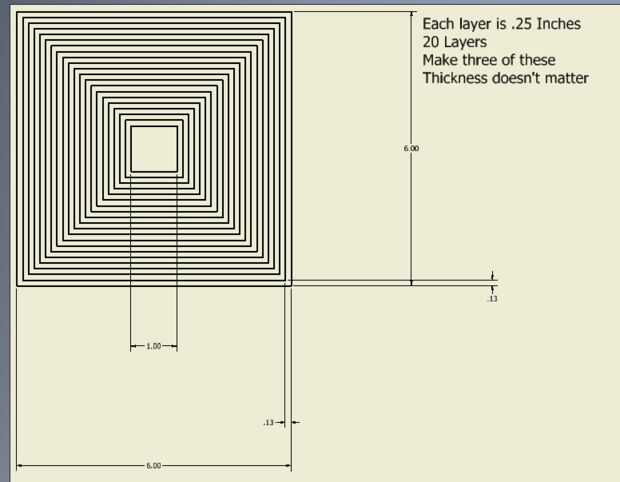 Para este paso necesita tener una máquina de corte láser. Usted necesitará hacer cuadrados que disminuyen de tamaño para crear una pirámide. Para el primer cuadro hice 6 x 6 y el grueso dentro de mi como.25 pulgadas. Yo seguí restando cada capa por.25 pulgadas hasta llegar a 20 plazas. Hice esto tres veces. El espesor de la madera no importa pero el grosor debe ser el mismo para la lámpara entera.