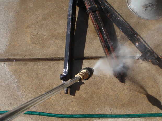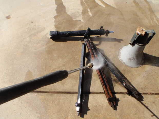 Una de las primeras cosas que hice fue presión lavar cada cosa, para deshacerse del lodo, las arañas y mierda general fuera el trípode y el altavoz. no van demasiado loco con la lavadora a presión en la madera como puede hacer que la madera vaya esponjoso o furia que nunca es una buena mirada. Esto quitó mucha de la pintura de perder e hicieron el trípode más viejo de lo que es. Había rematado con algunos muebles viejos que resalta la veta de la madera y restaura la pintura algunos qué.  La pintura no se ve tan oxidada, y para esa pintura terrosa dejar marcas cuando te toque.