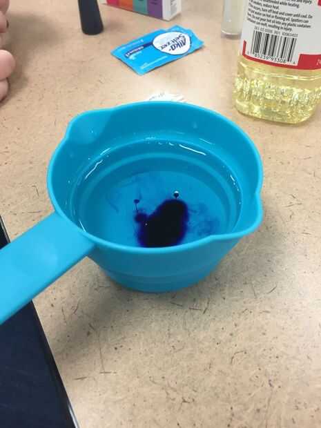 Elige tu colorante favorito y poner 3 a 5 gotas de colorante en la taza de agua.