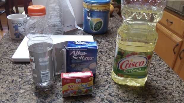· Botella de agua de aproximadamente 12,7 onzas· 3/4 taza de agua con una taza de medir· 32 onzas de aceite vegetal· Alimentos para colorear, alguna funcionará, un paquete de cuatro botellas de poco· Alka-Seltzer, alguna va a funcionar, solo paquete