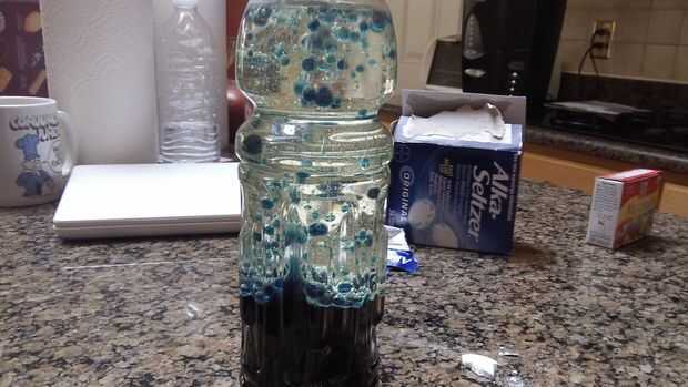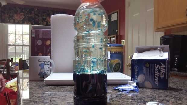 · Botella de agua de aproximadamente 12,7 onzas· 3/4 taza de agua con una taza de medir· 32 onzas de aceite vegetal· Alimentos para colorear, alguna funcionará, un paquete de cuatro botellas de poco· Alka-Seltzer, alguna va a funcionar, solo paquete
