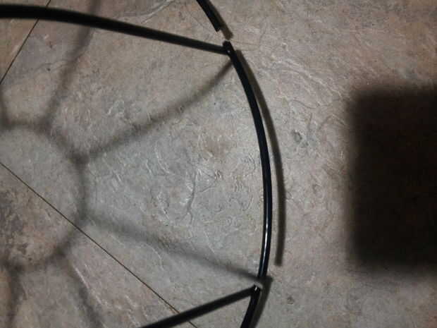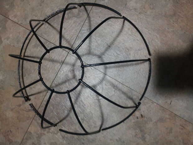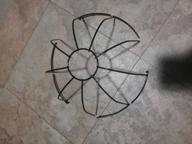 Retire temporalmente la cadena, se recorta, así que esto debería ser fácil. Corte a través de cada sección del más grande "aro" de la cesta de alambre, justo al lado de un alambre de soporte. He intentado hacerlo con cortador de alambre y el alambre de de que la cesta se hace es demasiado duro para los cortadores que tenía y me fui con la dremel en su lugar. Hay 9 cables soporte en este modelo de cesta, y quería utilizar 6 velas, por lo que quité totalmente las secciones aro junto a tres de los cables de soporte, porque se agachó y no tendrá velas. Me aseguré de sobra los lazos donde la cadena se supone que conecte a la canasta.