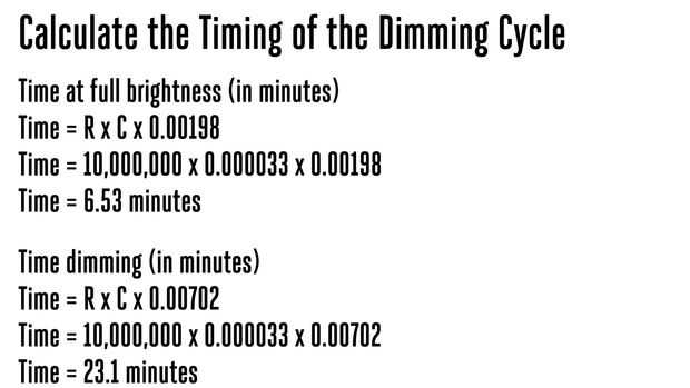 El momento de la regulación automática se determina por los valores del condensador y resistor. Con los componentes que aparecen en el esquema, la lámpara estará en el brillo completo durante unos seis minutos. Luego se atenuará gradualmente en los siguientes veintitrés minutos. También puede utilizar el potenciómetro para establecer donde el oscurecimiento comienza en el ciclo. Mediante el uso de diferentes valores, se puede cambiar cuánto tiempo tarda la luz para atenuar. Para determinar cuánto tiempo estará la lámpara en un brillo completo, y cuánto tiempo se tarda para atenuar, puede utilizar las siguientes fórmulas.