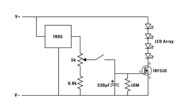 La función de atenuación automática se activa abriendo el interruptor entre el potenciómetro y el condensador. El condensador está inicialmente en el mismo voltaje que la salida del potenciómetro. Sin embargo, al abre el interruptor, el condensador drena lentamente a través del resistor de Mohm 10. Esto hace que la tensión en la puerta del MOSFET para la gota y la matriz de LED se atenúa lentamente durante un período de tiempo.