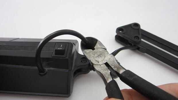Vamos a usar el cable que está conectado al adaptador de alimentación para suministrar electricidad a la lámpara. Así que no necesita de la lámpara original cable de alimentación. Para quitarla, sólo corte el cable cerca de la lámpara y tire a través de cada sección del soporte. Si hay algún componente integrado en el soporte, puede eliminarlos o simplemente cortar el cable en ambos lados.