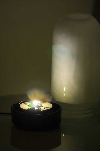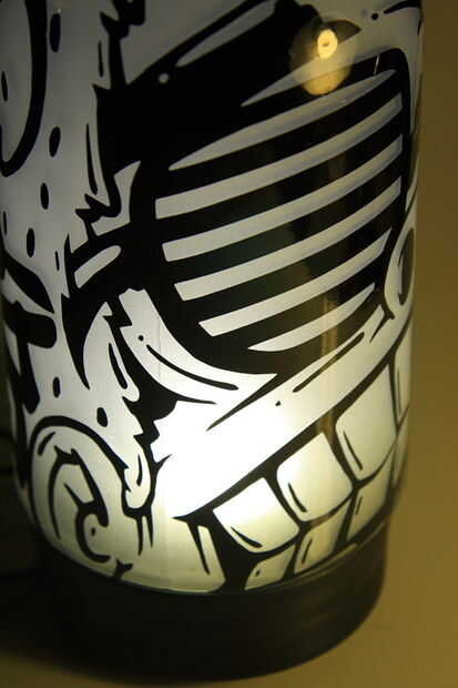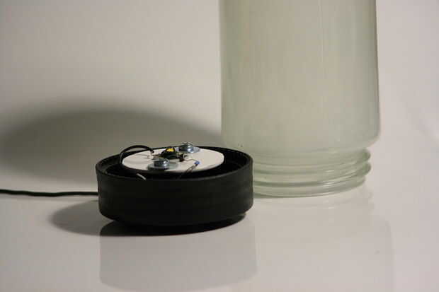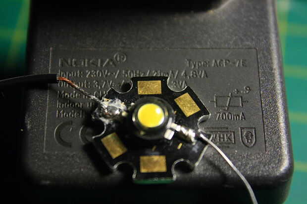 La idea detrás de esta lámpara era crear una lámpara ingeniosa pero funcional que utiliza pequeñas cantidades de energía durante su uso, así como la utiliza en su construcción - elementos que no son más utilizan para su función. Esta es una forma de ciclismo para arriba como 'vida después de la función principal'. La estructura básica de la lámpara es un LED de alta potencia accionado ubicado por una luminaria exterior estándar y cubierta de vidrio. La función principal del cargador del teléfono móvil Nokia utilizado estuvo a cargo de un teléfono celular hace aproximadamente 6 años. El cargador tiene ahora vida después de realizar su función primaria. El enchufe debe ser cortado y los cables para los circuitos de LED en la parte inferior de la lámpara. La pantalla de cristal claro de esta luz fue encontrada en un montón de escombros, limpiar y reservar. La fuente de luz es un LED de 1W de alta potencia (componente de compra estándar) que es alimentado por el cargador de teléfono móvil que es capaz de proporcionar una cantidad adecuada de energía para el LED. Este es otro diseño de iluminación, pruebas de aplicaciones de bajo voltaje LED, similar a las 30 botellas en la pared. El circuito está sujeta a una placa de montaje a una luminaria estándar normalmente uno montaría contra una pared exterior. La pantalla de cristal fue arenada en el interior, a mate la superficie y permitiendo a su vez la luz emitida por la luz difusa bajo el diseño gráfico.