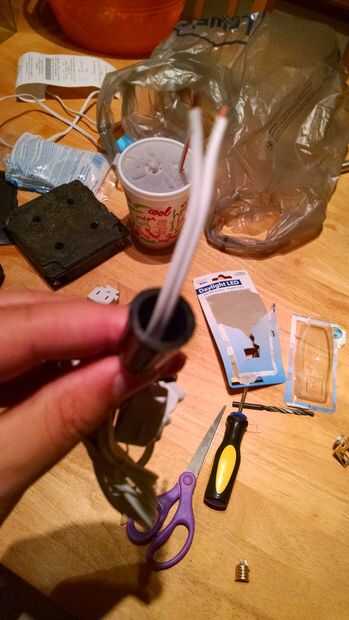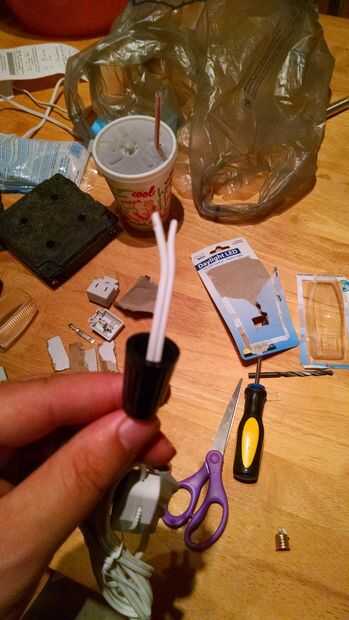 El cable que compré venía con un portalámparas que era innecesaria y el metal. Quería utilizar la tapa de plástico para albergar el circuito sólo creado, así que con un poco de trabajo, saqué la toma hacia fuera, cortar los cables y mantener la tapa de plástico. En este punto, usted querrá completar el proceso de soldado por soldadura de las líneas de AC para el LED y el diodo de potencia. Cinta tus circuitos con cinta aislante para evitar cualquier Short que se produciría con empujones los componentes en un espacio tan pequeño.