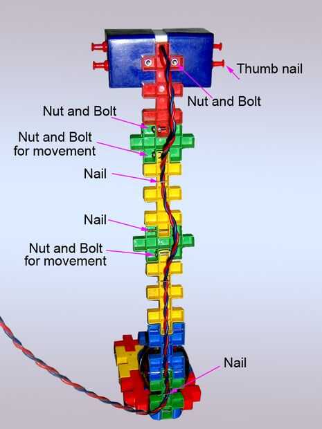 En esta foto se puede ver donde he utilizado tuercas y tornillos para movimiento y clavos para fijar las piezas plásticas juntos.