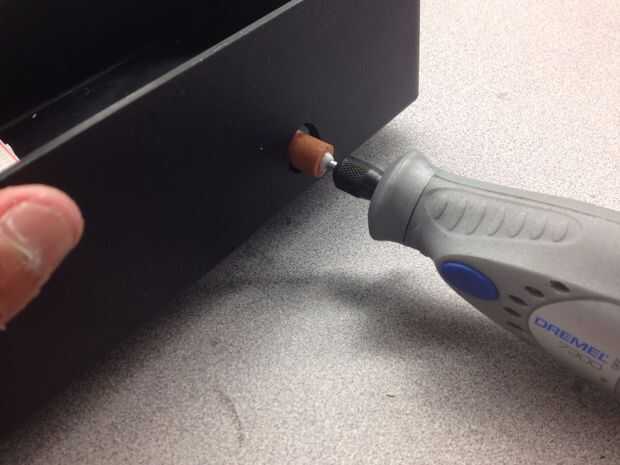 3. En uno de los lados más largos de la caja vamos a taladrar el agujero más grande a través de la parte inferior derecha de la caja para correr el cable a través. Este orificio debe ser aproximadamente de 1".