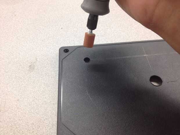 2. Vamos a perforar un agujero más pequeño a través de la caja derecha superior para ejecutar el sensor de infrarrojos. Este orificio debe ser aproximadamente de ½".