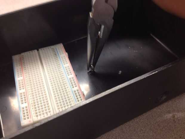 1. Vamos a perforar un pequeño orificio en la parte superior de la caja para funcionar los alambres a través. Este orificio debe ser aproximadamente de ¾".