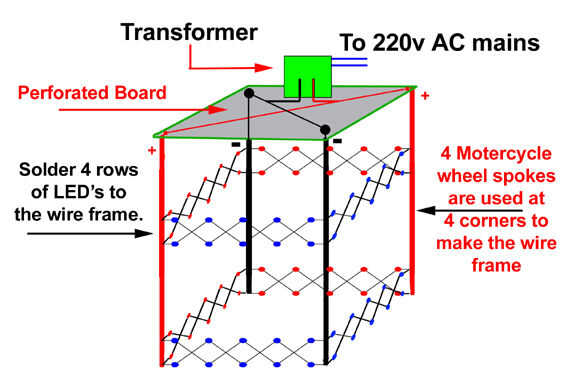 Soldadura 4 sets de 10 LED' s de un lado a la estructura de alambre como se muestra en la foto, manteniendo igual distancia para todos los sistemas de LED