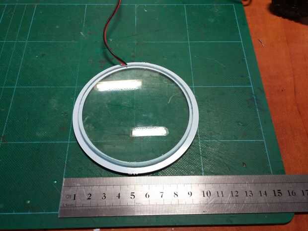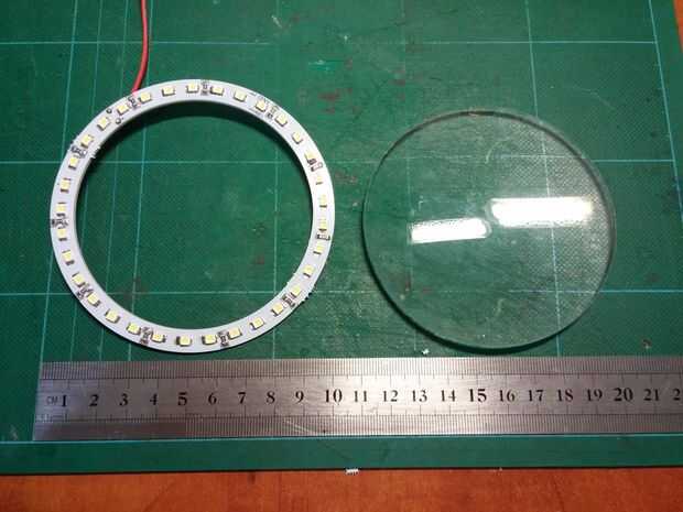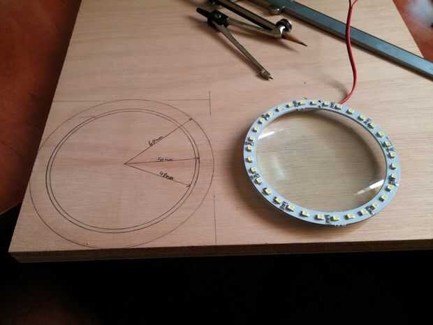 El diámetro exterior del anillo de LED es 100 mm de diámetro interior es de 84 mm. Asi que, me hice un aro de madera para dar cabida a la ventanilla. Se puede ver en la foto última que elegí hacer anillo de diámetro de 120 mm con 2 mm dentro de corte para el anillo. Cortar todo con una sierra de calar (deseo tuve una sierra de calar...) y la parte rebajada con una dremel herramienta de corte de azulejo. No tengo un router pequeño así que tuve que hacer hacer... esto fue sin duda la parte más difícil en el instructivo...