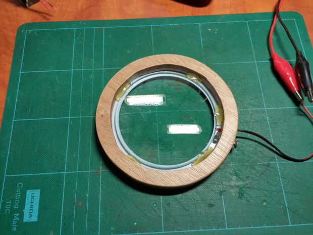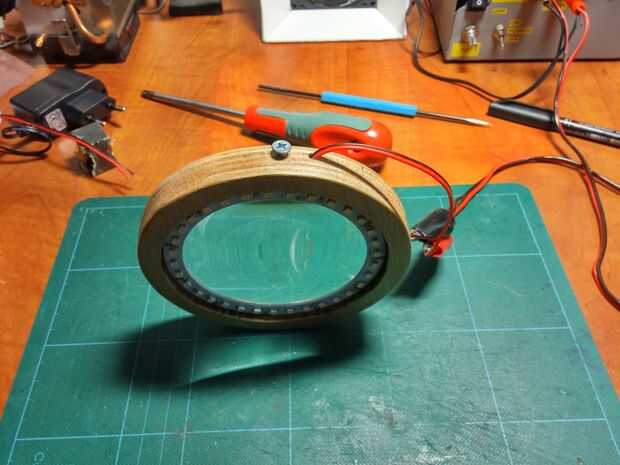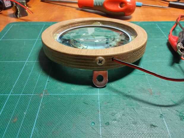 He perforado 2 agujeros, 1 para el perno de tornillo conecta el anillo en el brazo y uno para el cable. El tamaño del agujero y el tamaño del tornillo perno es hasta usted para decidir. Sólo asegúrese de que no es demasiado grande para que no interfiera con la colocación de lente aumento. Yo primero coloca el aro con una una muy pequeña cantidad de pegamento en caso de que es un problema poder tire limpio y fácilmente. He puesto la lupa en la parte superior del anillo (véase las fotos) y pegué caliente en 5 puntos. Necesidad de inundar todo con caliente no pegamento... el lado del objetivo es curso y que es la madera contrachapada, quedo muy fuerte...