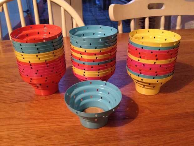 Para la lámpara de luz de té compré té ligeros titulares en ikea por 29 centavos pieza (sí, casé arrancó ;)). Voy a hacer un candelabro con anillos de estos titulares en ellos. Para guardar los anillos equilibrados usaré tres cadenas. Para hacer esto, se ve más bonita cuando para cada anillo, el número de titulares de luz de té se puede dividir en tres. Usaré 12 y 9 para los míos, así que necesito 21 titulares de luz de té en total.