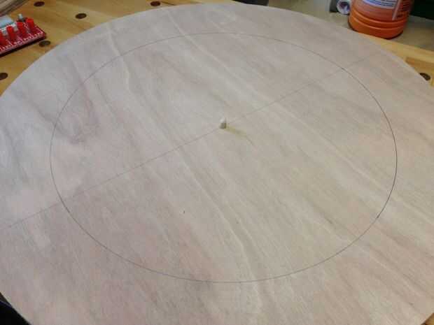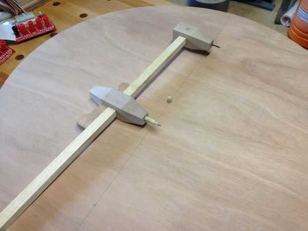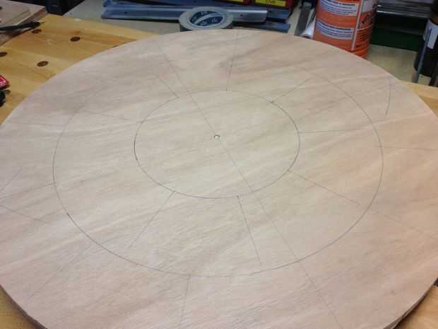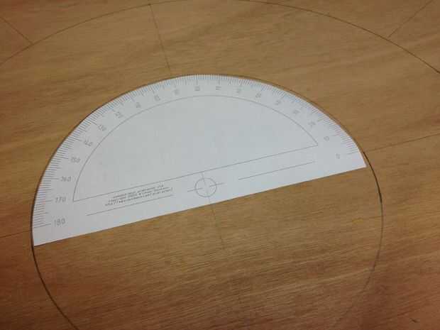 Después de marcar los anillos se puede marcar el espaciado de las luces de té. Esto es más fácil de hacer mientras que los anillos no cortan todavía. En el anillo externo habrá 12 luces, tantas 360 grados / 12 luces = una luz cada 30 grados. En el aro interior voy a poner 9, entonces uno cada 40 grados (360/9 = 40).