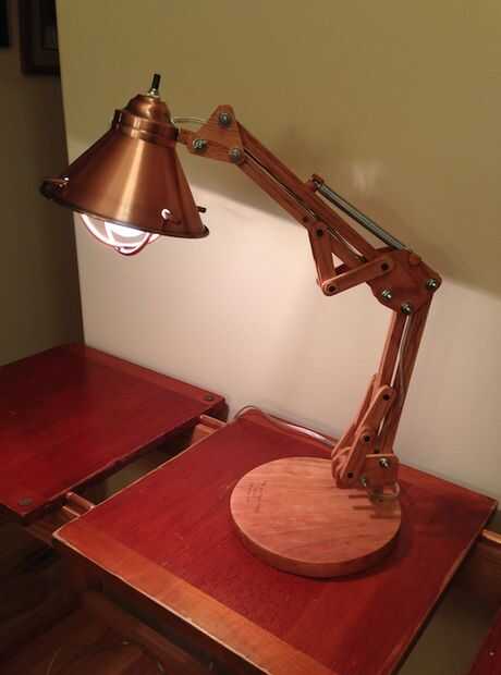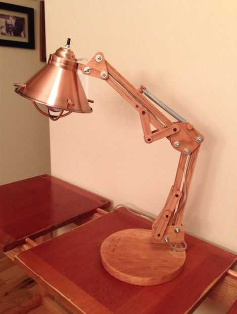 Ahora realmente está empezando a ver como una lámpara! Es hora de pegamento, arena y acabado. Corte el perno de sujeción utilizado para montar la pantalla a una longitud apropiada, forma las bisagras de madera, todo de arena y agregar un aceite mineral spirits/tung.