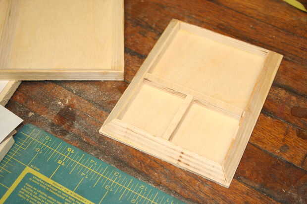 4. Corte unas tiras de 1/4" para colocar como estantes y pegamento y sujete en su lugar.