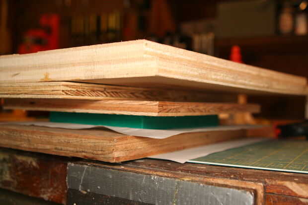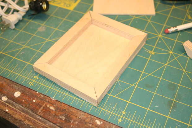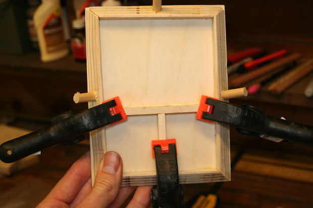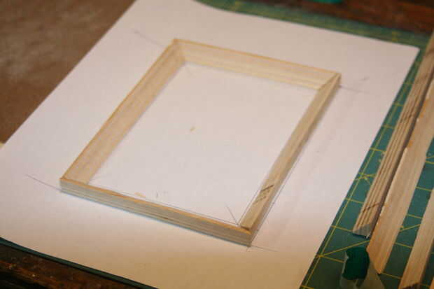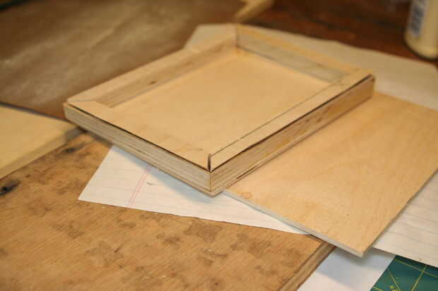 2. una vez que todas las piezas estén cortadas al tamaño, verifique el ajuste y hacer cualquier necesario lijar. Cuando estés satisfecho con el ajuste, pegamento el primer conjunto de tiras biseladas al perímetro de 1/8" de madera contrachapada. El exterior de la cinta y sujetar entre dos tableros.