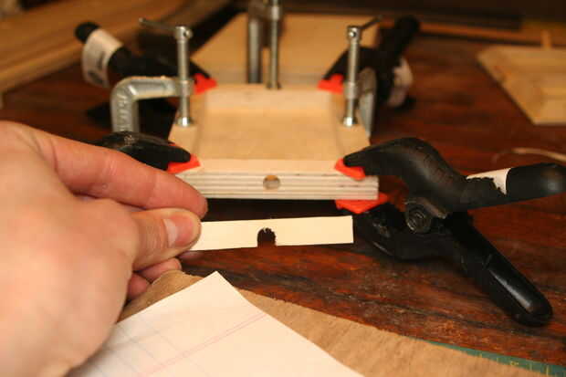 2. en uno de los más cortos, tiras de 1/2", taladro un orificio centrado 3/8" y corte el borde no se pegan para que sea abierto, como una ratonera.