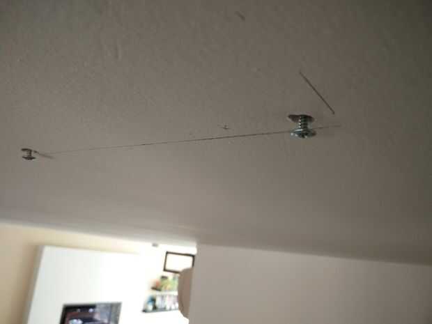 Perforar el techo, poner un anclaje y poner el tornillo (en orden para el tornillo ir dentro de la pared que necesita para aumentar el tamaño del orificio externo - que forma el tornillo será "dentro" de la pared y todo se verá son las cuerdas del hilo de pescar