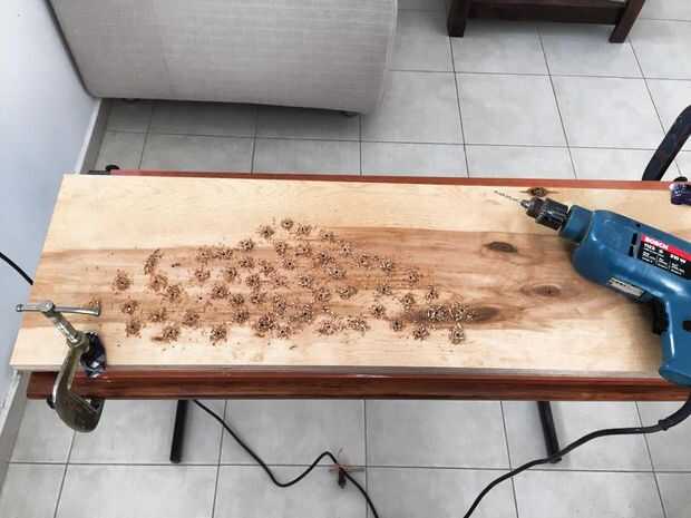 He utilizo algunas abrazaderas para obtener todas las tablas a cada otro y comenzó con la perforación. La extracción tienes las tablas entre sí el menor problema con la madera que tendrá (podría quebrarse desde el otro lado de la perforación). En caso de conseguirlo, sólo puede utilizarlo como una parte interior.