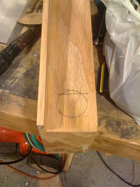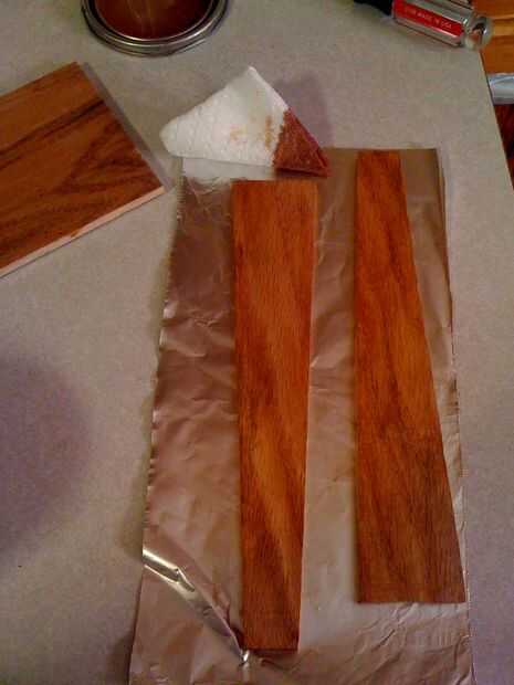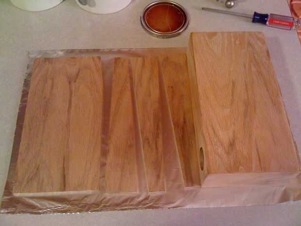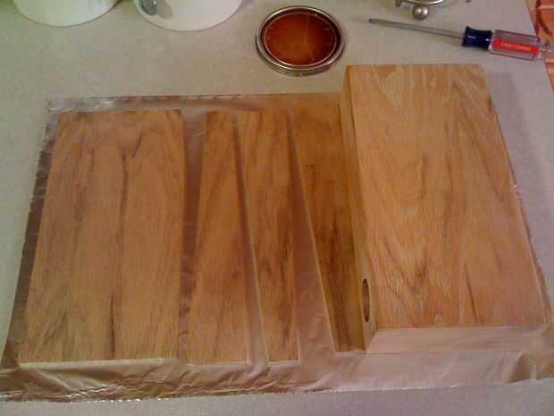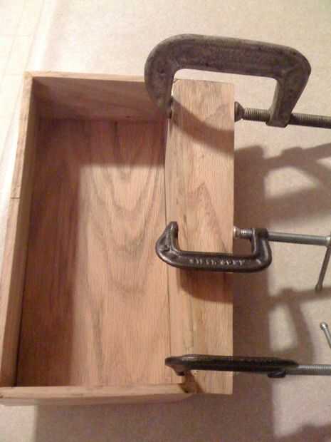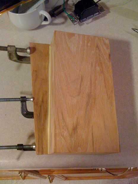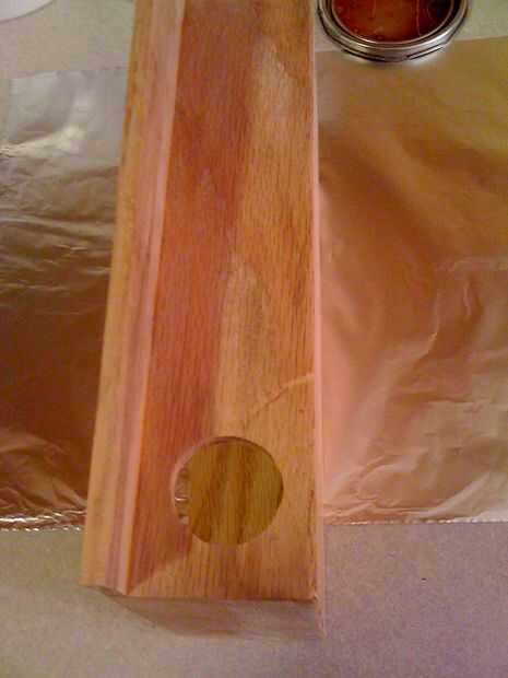 Here is one of the easy parts.  Fijación en el de la sombra cónica hacia el lado con pegamento para madera y abrazaderas tipo C.  Después de seca arena abajo todo el exceso de madera pegamento que está en el exterior de la caja.  A continuación que sólo tenemos que perforar un orificio para el codo.  Sólo encuentra el codo en la madera y remontado su circunferencia puede utilizar una broca madera agujero punzón o 1" perforar.  Usé una Dremel para suavizar el borde del agujero.  Hay muchas maneras para teñir madera generalmente utilice una toalla de papel o un trapo viejo introducirlo en la mancha y cepillar a la madera para eliminar trazos de pincel sobre la madera. Después de que se seque solo ligeramente arena con lana de acero (yo usé #00) para eliminar cualquier baches en la mancha y será liso y brillante.