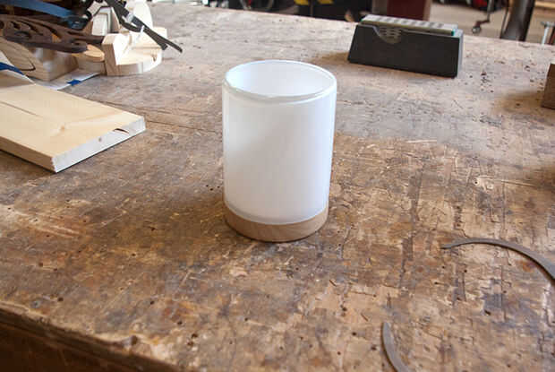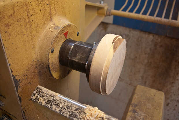Empecé con una pieza cuadrada de trozo de madera verde oliva, más 1" de espesor. El bloque está montado en una placa de cara y maltratado. Quería que el exterior del vaso para estar en consonancia con el exterior de la base, por lo que la madera se da vuelta hasta el verde oliva con el vidrio.