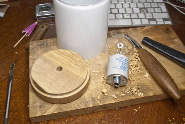 Para montar la lámpara cerámica, unos agujeros hay que taladrar a través de la madera. Uno debe ser el diámetro de la varilla roscada que se conecta a la lámpara. La otra es en la parte inferior de la base, un agujero un poco más grande es lo suficientemente amplio para la tuerca de ajuste a rebajar de la base.