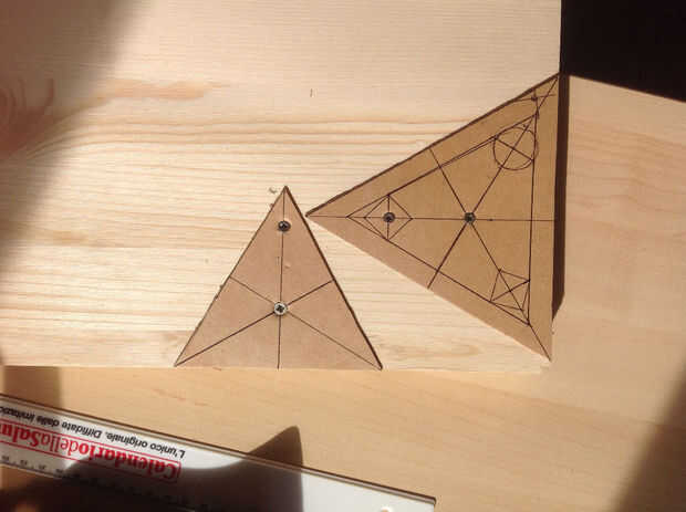 2 - después de dibujar las líneas para encontrar el centro del triángulo para hacer un agujero para el cable eléctrico