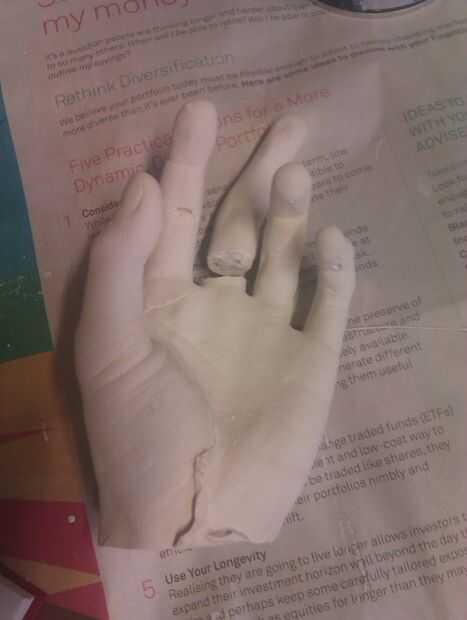 Retire con cuidado el molde de yeso del alginato utilizando el cuchillo Stanley. Todos estos paso deben hacerse con cuidado ya que los dedos son increíblemente frágiles.