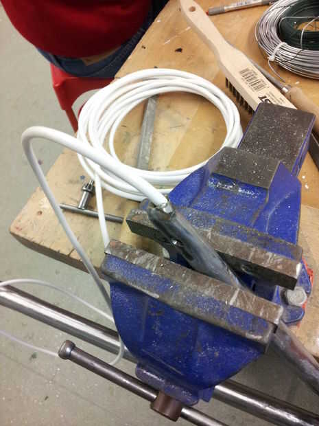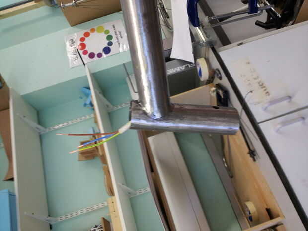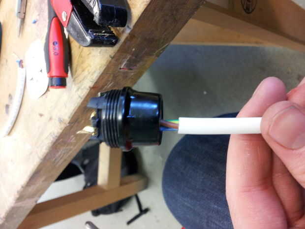 Que han logrado conseguir el alambre a través del marco, ya tiene que trabajar en las conexiones de cableado. Primero apagado necesita pelar los cables, utilicé pelacables pero en su lugar puede utilizar tijeras. Ahora usted necesita cortar una longitud de cable lo suficientemente largos para llegar a la otra conexión de la parte superior. para conectar la conexión que primero necesita el alambre que atraviesa el marco con el alambre que va hacia abajo del tubo de dirección, esto puede ser girándolas juntas. A continuación atornillar los cables azul y marrón agradables y apretados, entonces usted necesita conectar el cable de tierra (verde y amarillo). una vez hecho esto puede el caso sobre los conectores de tornillo y repetir el proceso con la otra guarnición.