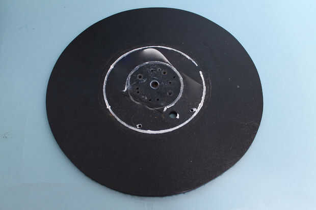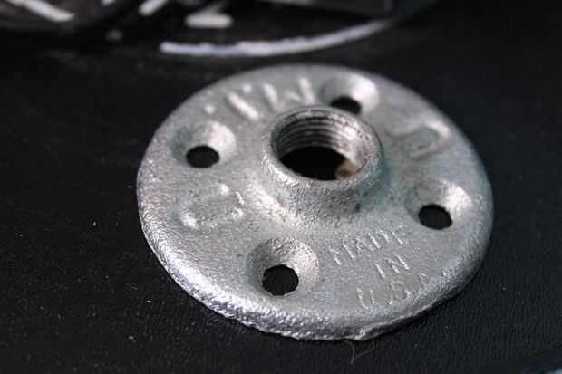 La base es 11" de diámetro 1/4" ABS con textura en la parte superior. El eje central es un 16-1/2" largo 1/8 IP tamaño tornillo pipa asegurada a la base por un montaje de brida piso. Se utiliza un adaptador desde la IP de 1/8 a la brida del piso. Orificios están roscados en el montaje para que contador hundido tornillos instalados desde la superficie inferior de la base mantenga la conexión a la parte superior de la base circular. La parte inferior de la base se cubre con negro sentía sostenido en lugar con adhesivo en aerosol para evitar que se raye la superficie de que la lámpara de mesa está sentado en el.