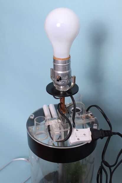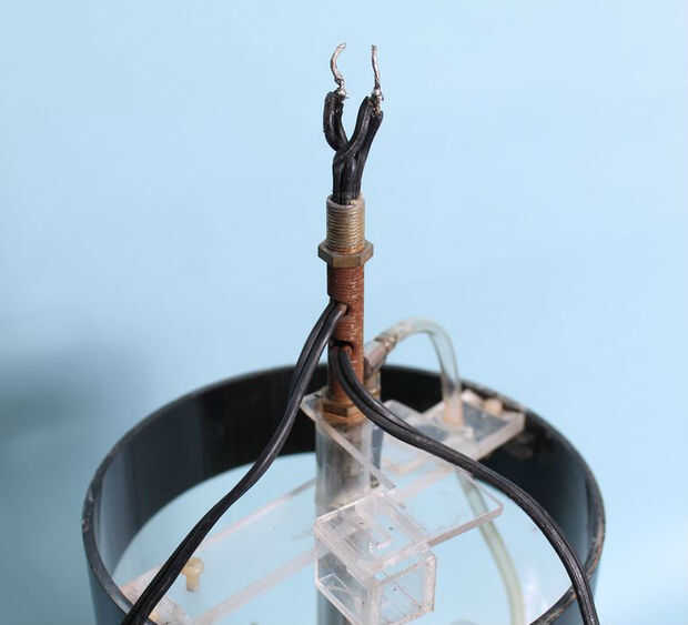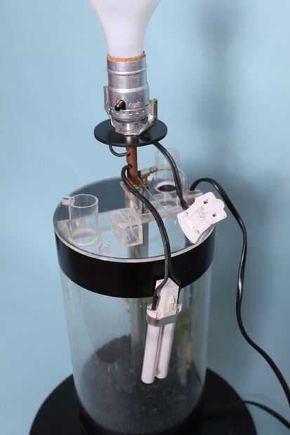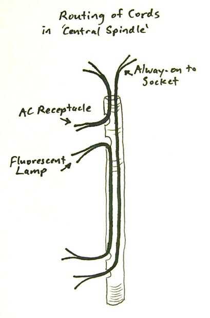 El eje central lleva dos 18 AWG SPT-1 (más delgado que el SPT-2 utilizado para el cable de alimentación de la lámpara) los cables de la lámpara. Estos cables van desde la Base de la lámpara hasta debajo de la cubierta superior. Uno de ellos lleva siempre encendido de la lámpara y el calentador AC Sockets. El otro cable se conecta a los pines de la lámpara fluorescente de 5W. Los dos cables SPT-1 apenas encajan el eje central 1/8 IP tamaño tornillo de tubería. Dos muescas se presentan con una lima circular en la parte superior del eje central y dos en la parte inferior. Estas muescas son donde los cables de entrada y salida al eje central.