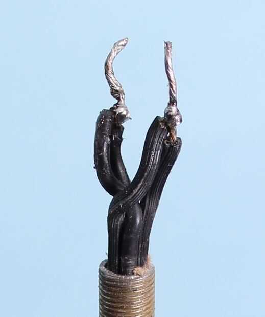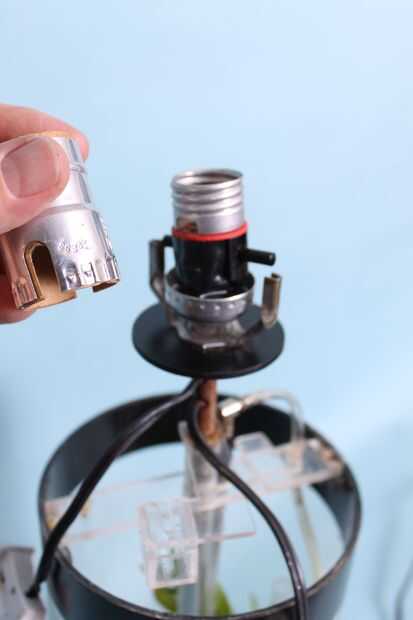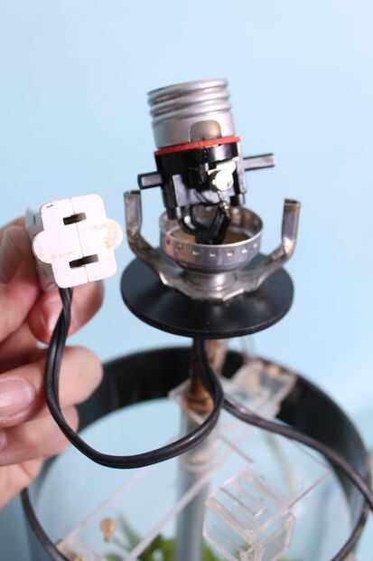 Los dos cables saliendo de la parte superior del eje central son despojados y conectados al enchufe de la lámpara conmutada con el neutro (lado acanalado, lámina ancha) conectado al terminal de la plata/blanco. Para empalmar los cables es más fácil para envolver los conductores en el cable del tomacorriente calentador alrededor de los conductores a los bornes del portalámparas y suelde la conexión. Entonces los conductores del cable del portalámparas pueden fijarse a los terminales de portalámparas. Añadir más cinta aislante sobre los terminales de portalámparas para asegurarse de que no corta el metal del cuerpo portalámpara. Paquete de los conductores en la parte inferior de la lámpara y coloque el portalámparas juntos cuidadosamente. Que tenga que tirar flojo abajo de la portalámpara para que todo se ajuste.