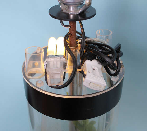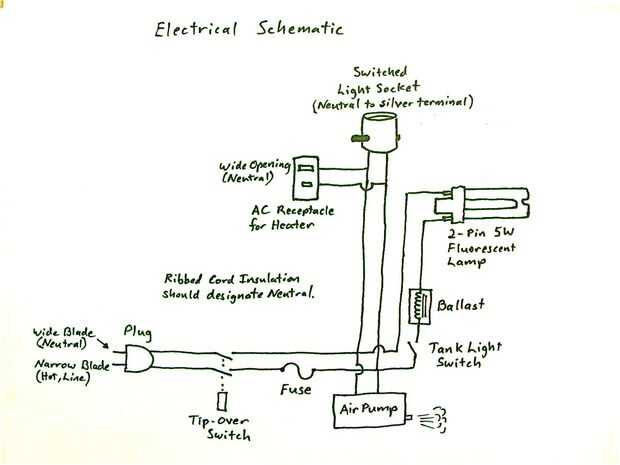 Los componentes de la Base: la bomba de aire (tienes que cortar la mayor parte de su cable de alimentación), el lastre fluorescente, el fusible soporte (y fusible de 2A), e interruptor de vuelco (émbolo resorte pasa a través de un agujero en la placa base) están conectados por el esquema. El cable de alimentación de la lámpara sale de la base a través de una muesca en el borde inferior de la caja Base. El cable debe estar bien ajustado a la placa de Metal dentro de los lazos de alambre/zip Base wth para asegurarse de que no se deslizará si tira.