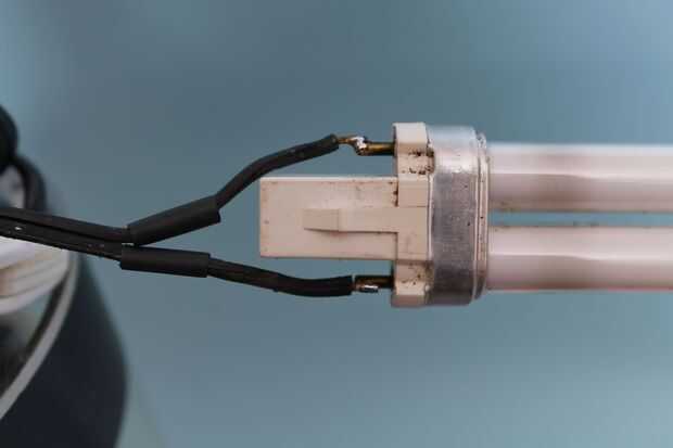 El cable de la lámpara fluorescente de 5W sale la muesca inferior en la parte superior del huso Central. Sus conductores son tachuela soldada directamente a los pines de la lámpara fluorescente. Sólo una lámpara de fluorescentes de dos pines se puede utilizar como este tipo tiene su propio motor de arranque botella resplandor interno que se iniciará automáticamente la lámpara. Tubería del encogimiento del calor debe ser desliza sobre los cables antes de soldar empujado en su lugar cubriendo la Junta del solador y pin y encogido en su lugar con una pistola de calor. Asegúrese de cubrir completamente cualquier expuestos conductores eléctricos/pins. Deslice la lámpara fluorescente por su soporte de plástico.