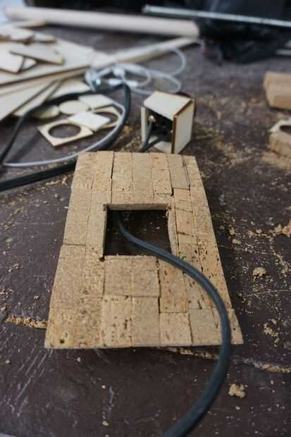 Pase el conector por la plaza abierta y perfore un agujero en la plaza que ha cortado. Asegúrese de que el agujero quede el cable. Cortar el cuadrado por la mitad y luego pegarlos a la Junta de corcho.