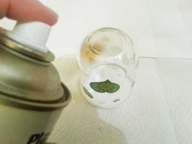 Asegúrese de que está fuera o que esté bien ventilada la habitación en que estás y que las superficies están cubiertas. Siempre siga las instrucciones en la lata de pintura aerosol. Pintar cuidadosamente la parte exterior del vidrio, incluyendo sobre las pegatinas. Lo mejor es construir capas lentamente, dejándola secar entre capa y capa para evitar que la pintura corriente o goteo. Continúe hasta que la jarra está completamente cubierta. Deje la jarra hasta que la pintura esté completamente seca.