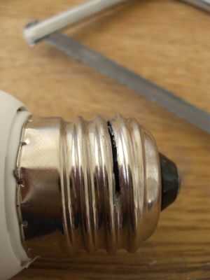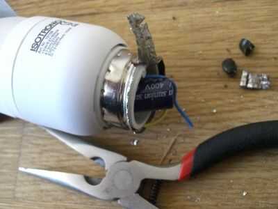 Realmente encontré que era más fácil utilizar una sierra para cortar a través de la rosca de la bombilla, entonces una vez que se corte la parte inferior, aplastó el fondo con las pinzas para romper el cristal (supongo que es lo que hay) para obtener el alambre-gafas de seguridad probablemente una buena idea ;) De hecho sería más seguro solo cortar el cable que baja abajo como sea posible, sobre todo porque sólo estoy suponiendo el material de vidrio no es tóxico! Aunque supongo que tendría que o bien ser vidrio o por lo menos algunos resina inerte, ya que es el aislador entre el vivo y el neutro. por cierto, usted quiere tener cuidado si se rompe el bulbo de un CFL debido a que contienen mercurio.