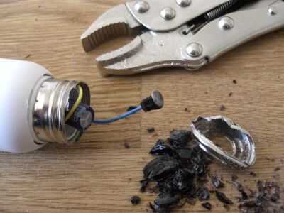 Trató de sacar la base de metal con pinzas con seguro según lo sugerido, pero no pudo conseguir que se movió - y mientras trataba de cayó el bulbo y lo había agrietado. Pegado a la lámpara en un portalámparas para ver si funcionaba pero estaba muerto -, por lo menos me dio una bombilla práctica antes de tratar a los demás.