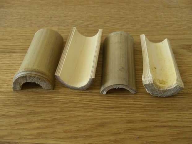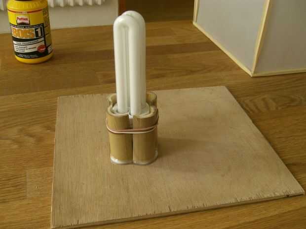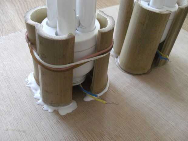 Buscaron alrededor de alguna manera fijar las bombillas a la base y encontró algunos bambú de sobra de hacer el Polo para mi lámpara de pie. Corte unas longitudes cortas, dividirlas en mitades a lo largo, luego para cada bulbo madera-pegué 4 de estas piezas a la base para hacer una especie de taza a la bombilla, con gomas para sujetar las piezas apretadas contra la bombilla para mantener la forma correcta mientras el pegamento secado.