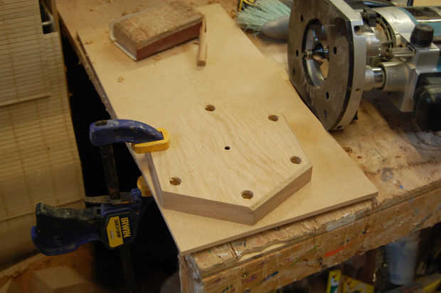 Taladré agujeros de 12mm en la parte inferior de las piernas (no a través) y un agujero de 29mm en el centro de la parte superior para recibir el sostenedor de la lámpara (otra vez, no a través). Había biselado de los bordes con mi router, y le dio amor con papel de lija.