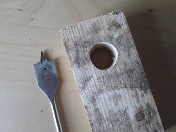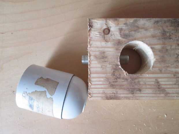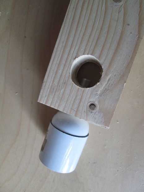 Encontrar una pieza de madera que se adapta muy bien en el rollo de cartón. Se puede hacer poco más bajo que el rollo por lo que el sochet será hundida en el rodillo. ¿de taladro 25 mm? aprox. 3 cm desde la parte superior del agujero. Perfore otro agujero en la parte superior del bloque para ajustarse al tubo de tornillo para conectar la toma de corriente. Si tienes suerte como yo el tubo se adapta cómodamente y no necesita pegamento.