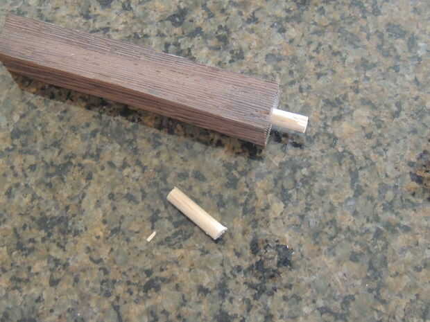 cortar 4 piezas de 1/4 pulgada pasador justo debajo de una pulgada largo luego ponerlas en los agujeros de columnas con madera pegamento para mantenerlos allí.