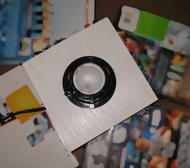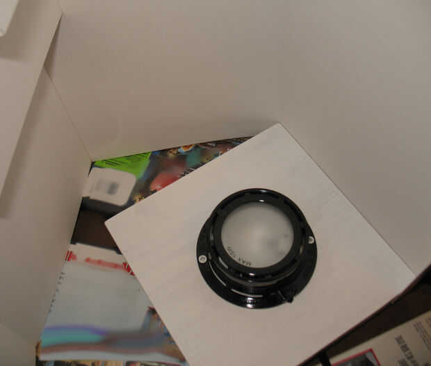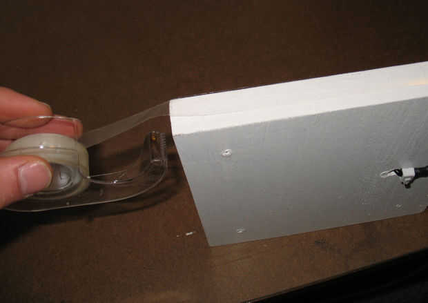 Abre la lámpara y coloque la tapa en la parte posterior izquierda de la base. Pulse en la cinta para adherir. Alinear este rincón también es indispensable para facilitar la construcción. Continúe alrededor de la base adherir el papel a la cinta.