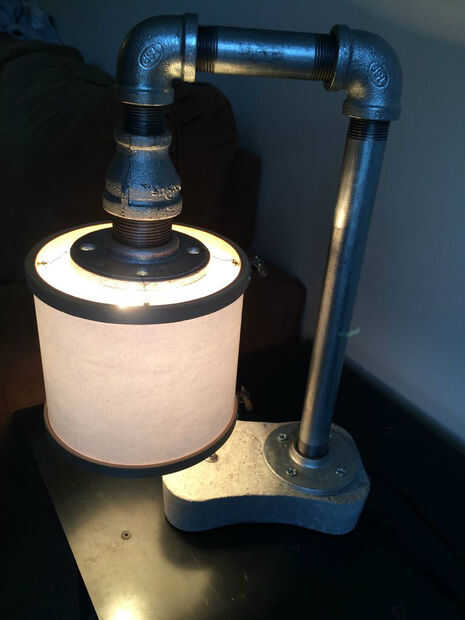 Basado en algunos otros diseños que he visto, he hecho esta lámpara de mesa de tubo galvanizado, con una base de cemento y un switch. La sombra es también casera de un par de aros de madera bordado y un papel de acuarela.