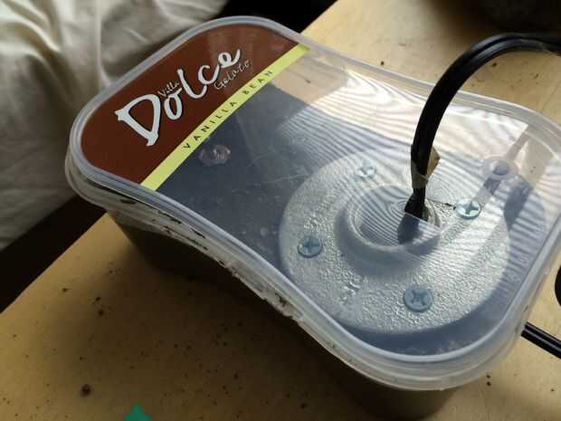 A pesar de lo que se puede esperar, cemento no "seca" como hace la pintura. Establece, y lo hace sólo en presencia de humedad. Reemplacé sin apretar la parte superior del envase a la humedad. Hice un agujero para que el cable podría venir a través. Colocar todo esto en algún lugar que no sea dañado si se filtra algún cemento alrededor de la médula.