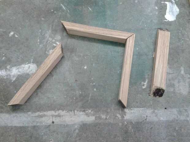 Utilice un cuttingmachine eléctrico para cortar el oakwood en ángulos de 45°.