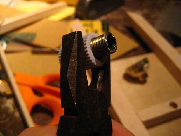 Si se taladra el agujero de enchufe bombilla con la broca de tamaño correcto, el tornillo de montaje debe atornillar cómodamente. Un poco de pegamento ayuda demasiado. No montar el zócalo del bulbo todavía